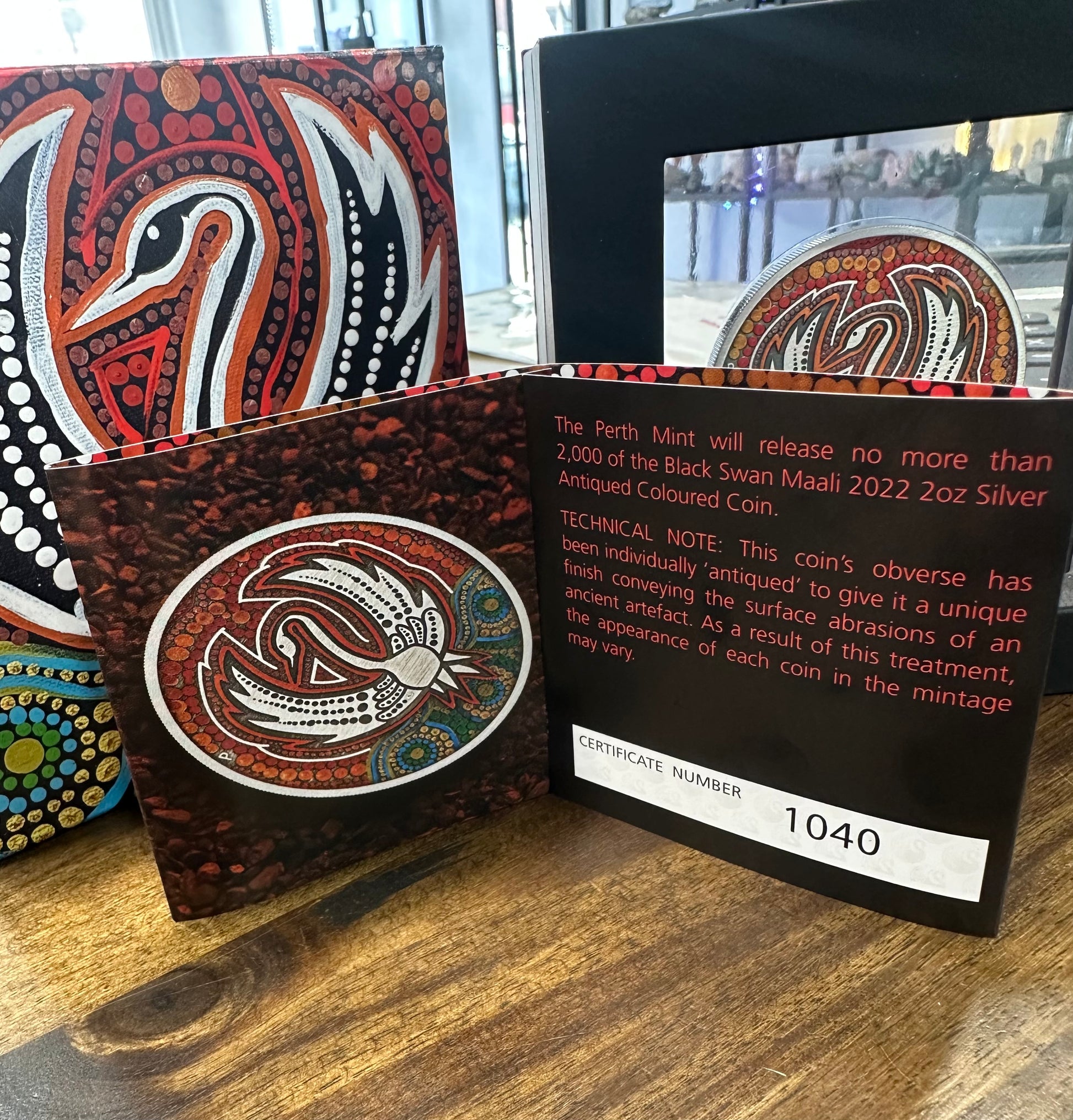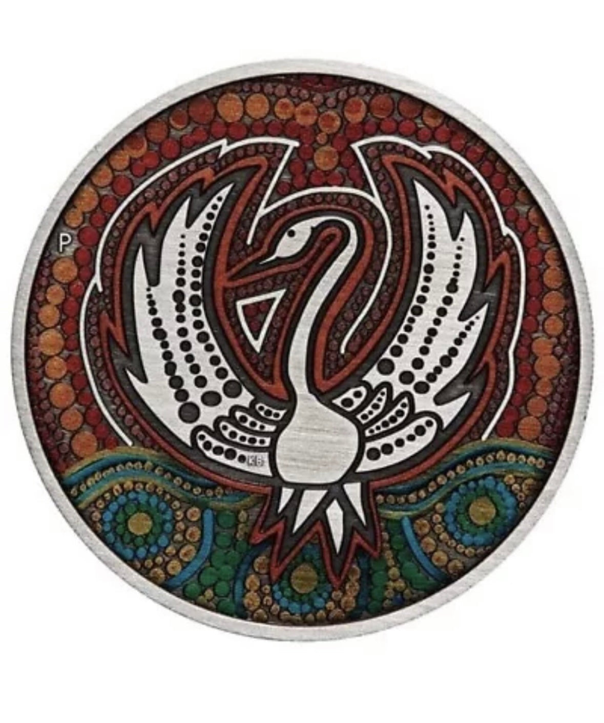 A 2oz antiqued silver coin portraying an original coloured painting of a black swan by Western Australian Indigenous artist Kevin Bynder.