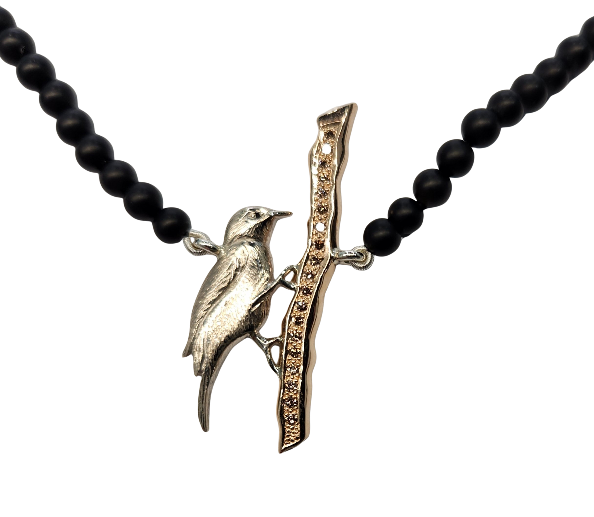 Brown Tree-creeper I is handcrafted in 9ct white and rose gold as a stand alone piece of wearable jewellery art.