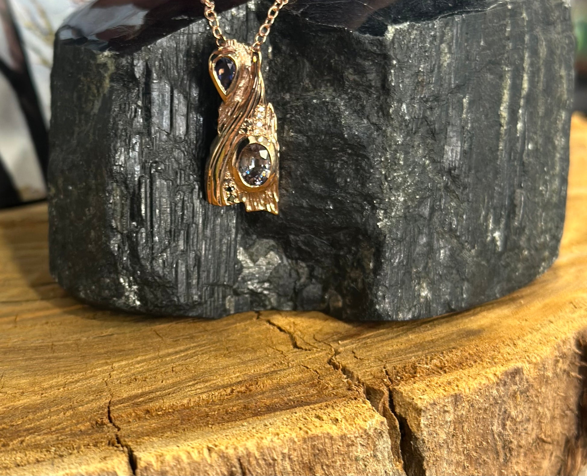 Handcrafted in 9 carat Rose Gold set with Spinel, Iolite and black & white Diamonds