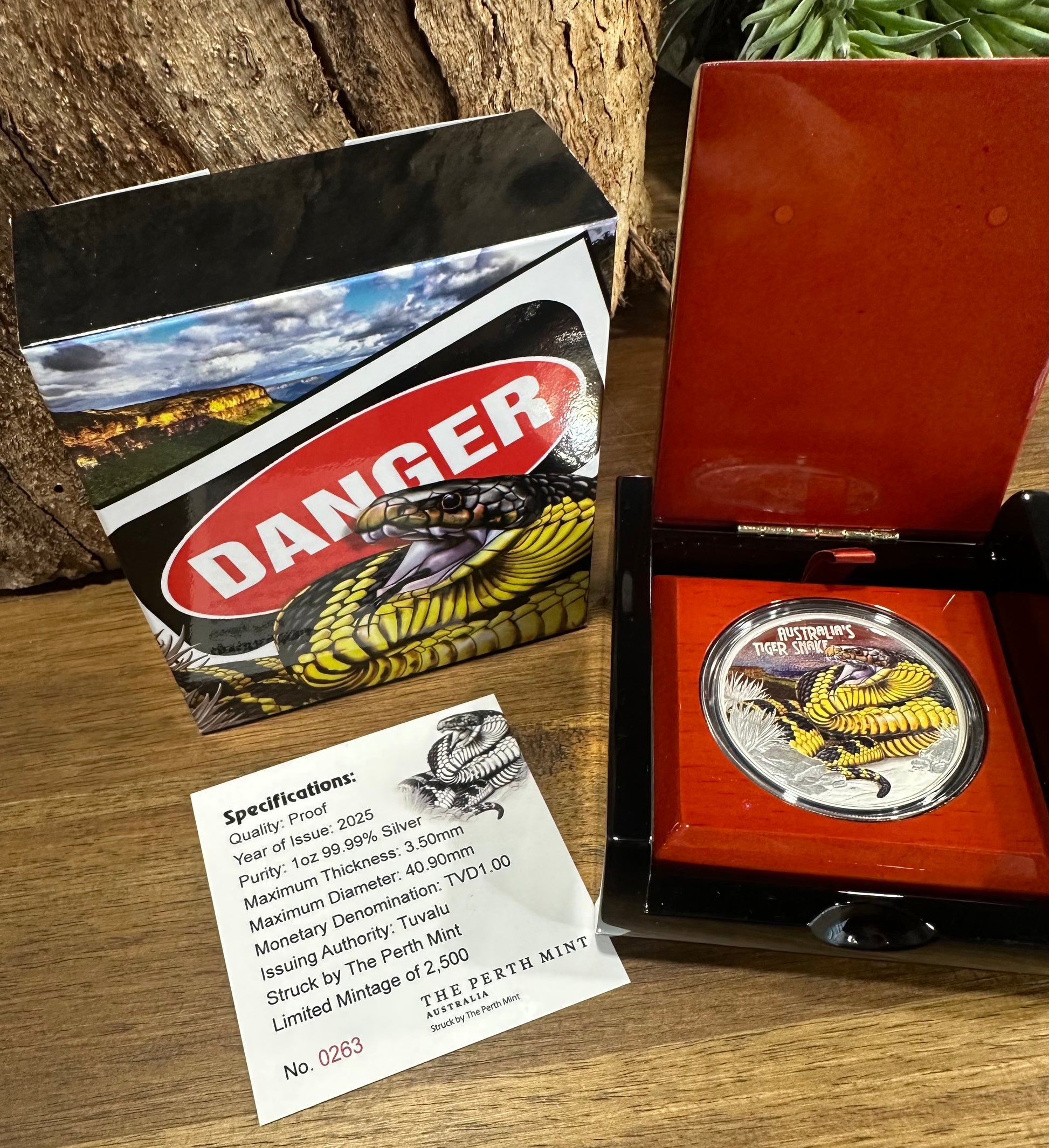 Representing a major milestone in the history of modern collector coinage, we are proud to present the 20th issue in the famed Deadly & Dangerous Series – the 2025 $1 Tiger Snake 1oz Silver Proof!
