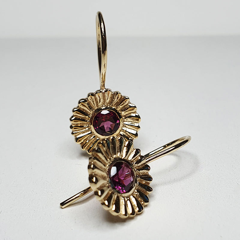 Crafted in 9ct yellow gold and set with rhodolite garnet, these earrings are suspended on a fixed hook for easy use.