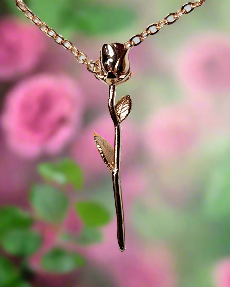 Sculpted Jewels Long Stemmed Rose Pendant is the flower that will never wilt. Delicately crafted in 9ct rose gold and suspended on a fine gold plated 45cm chain, it can be worn as a symbol of love and fidelity.