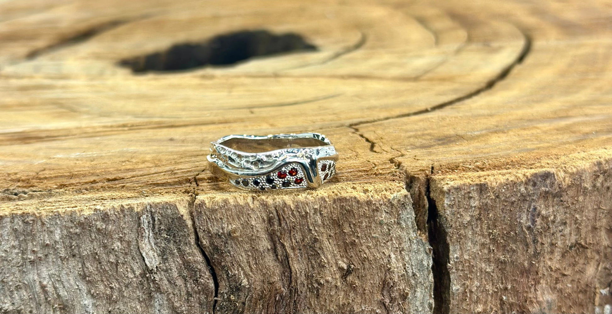 Handcrafted in 9ct White gold set with African Garnet and Black diamonds