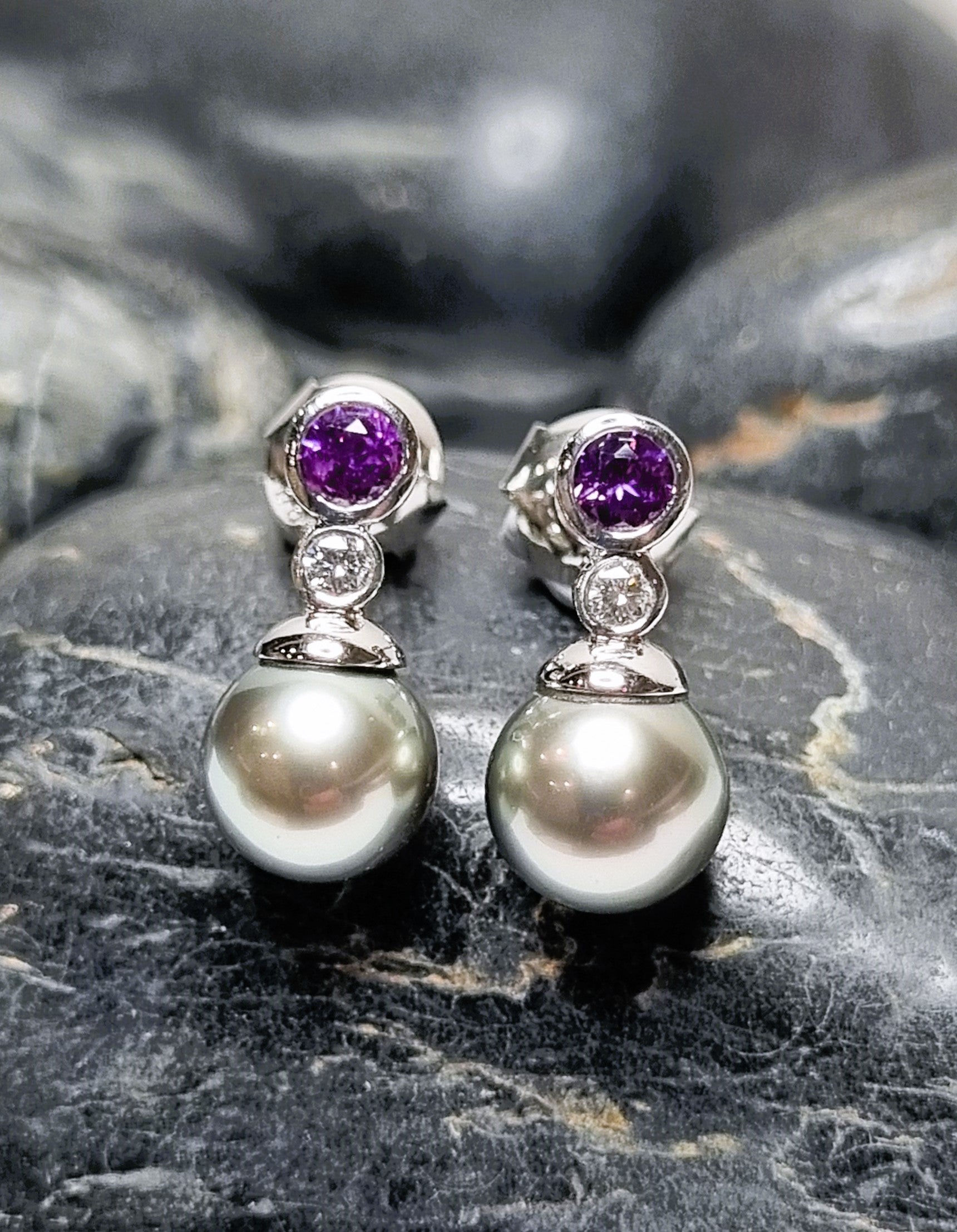 Handcrafted earstuds in Platinum, set with Cook Island Black Pearls with Purple Sapphires and Diamonds D-F VS2.