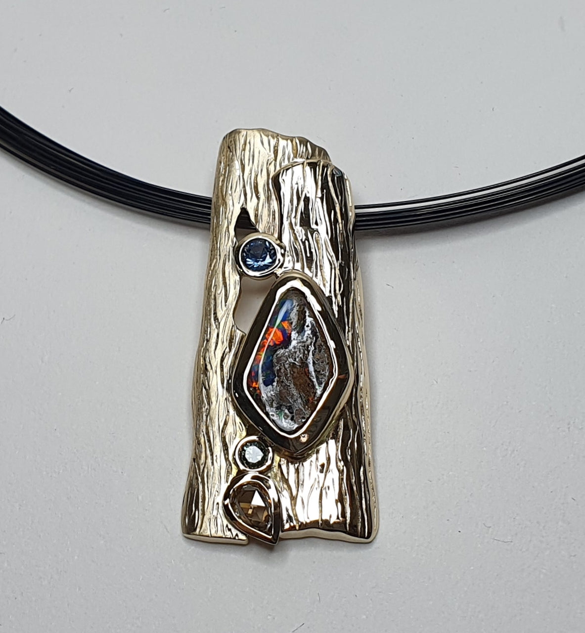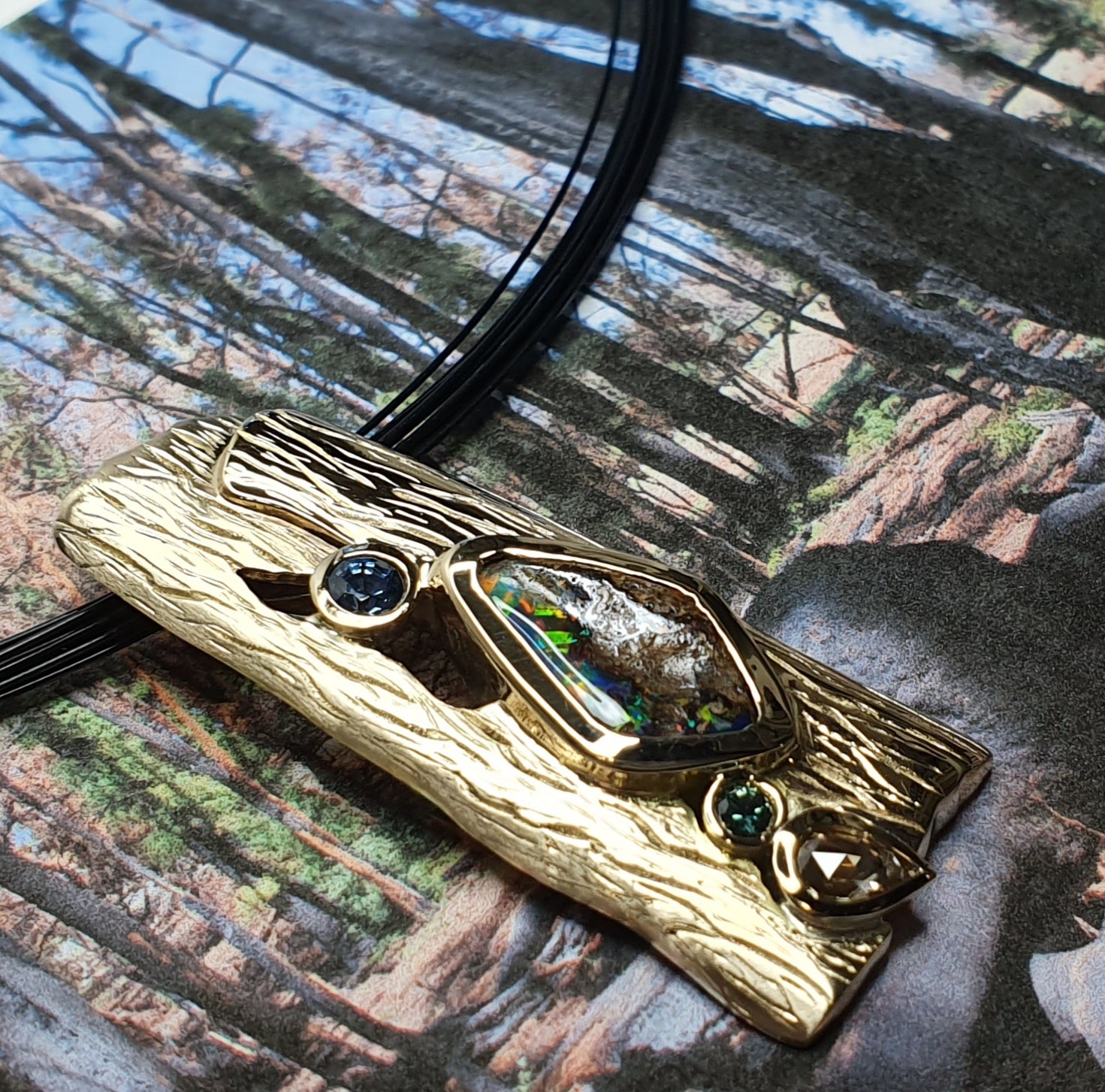 Handcrafted in 9ct yellow gold, this one of a kind pendant is set with Queensland boulder opal, champagne diamond, green sapphire and blue spinel.
