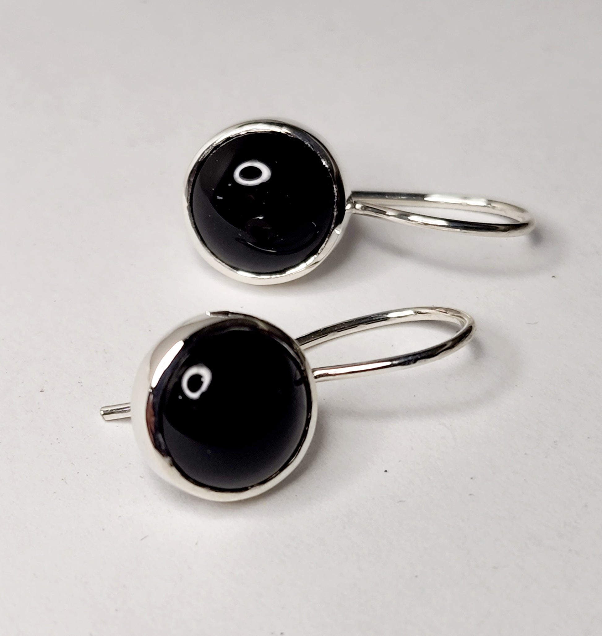 Crafted in sterling silver and set with 9.0mm round jet black onyx, the gemstones are suspended on a fixed hook.