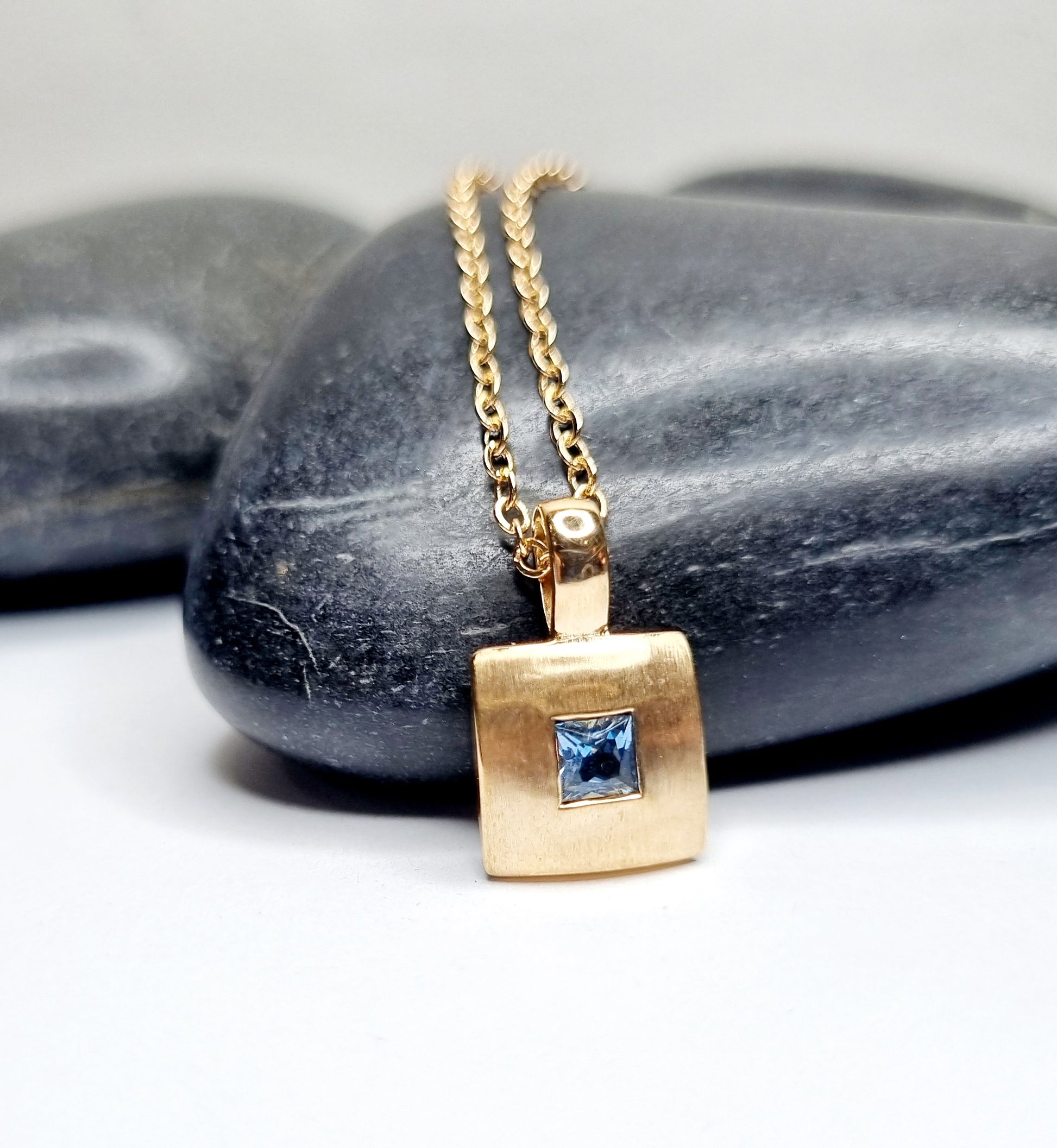 This exquisite 9ct Yellow Gold Pendant is incredibly sweet and simple. It is a brushed finish with a Princess cut Aquamarine at it's centre. This would be a lovely gift for someone who loves minimalist jewelry.