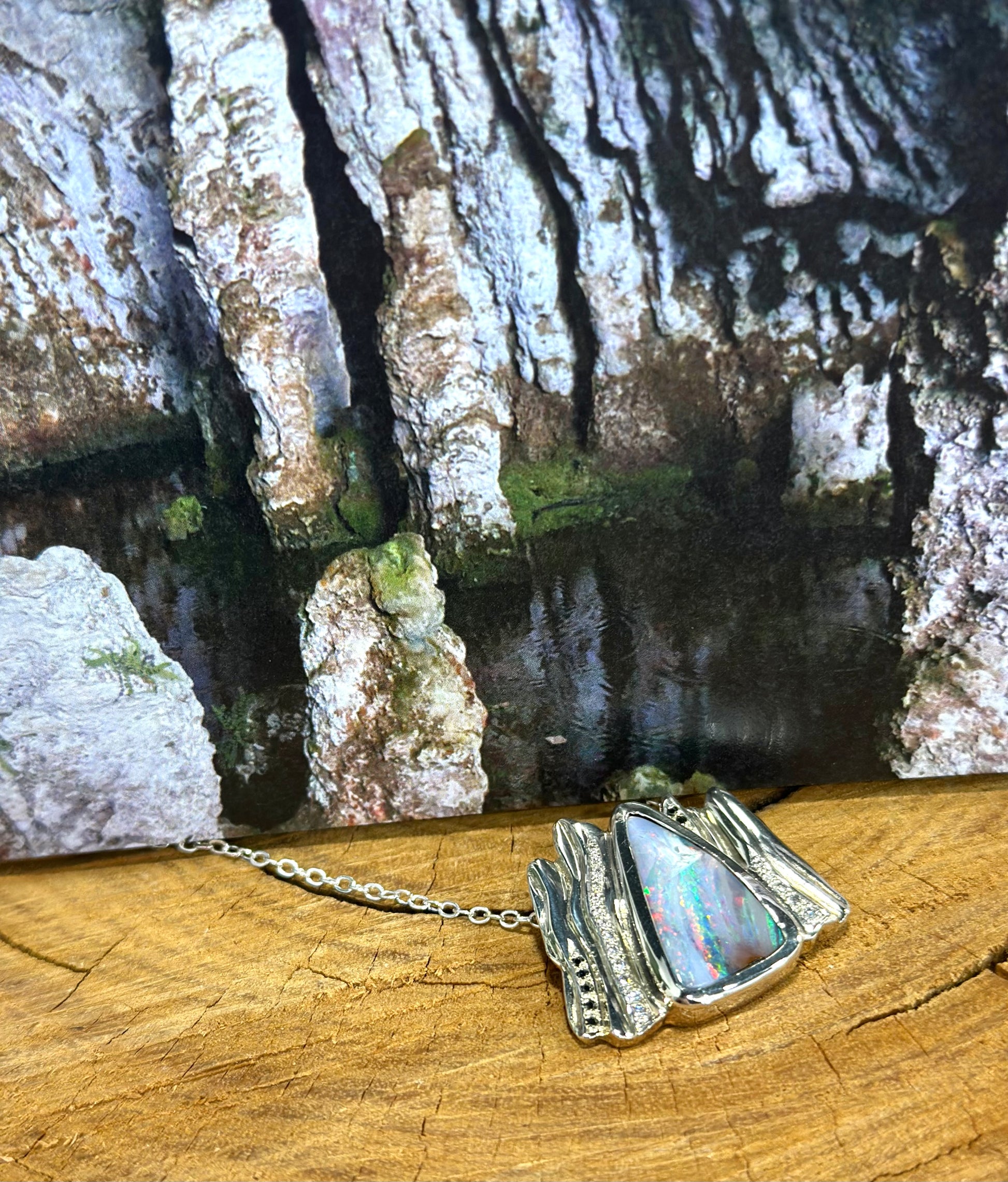 Expertly handcrafted in 9 carat white gold … set with a magical 4.23 carat QLD boulder opal, white and black diamonds.
